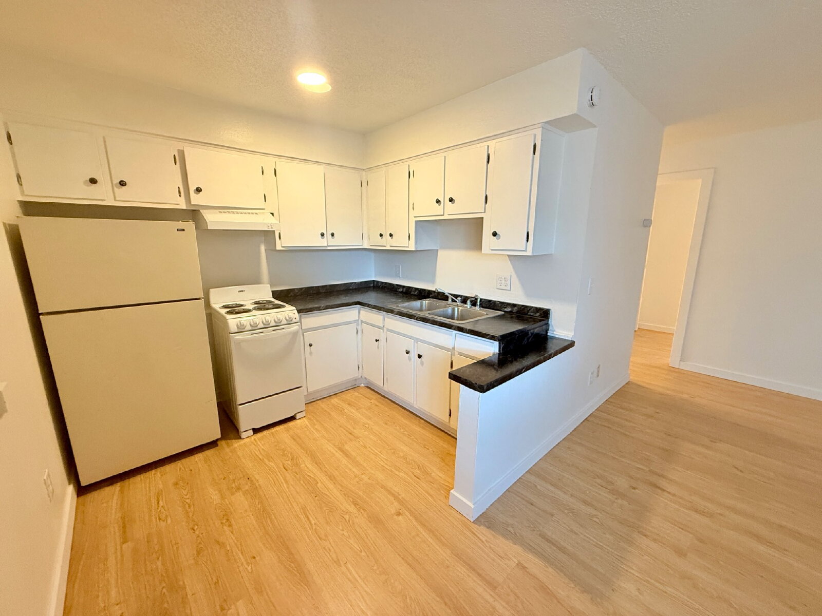 Updated kitchen with cabinets, countertops, and appliances included (range/oven, refrigerator)