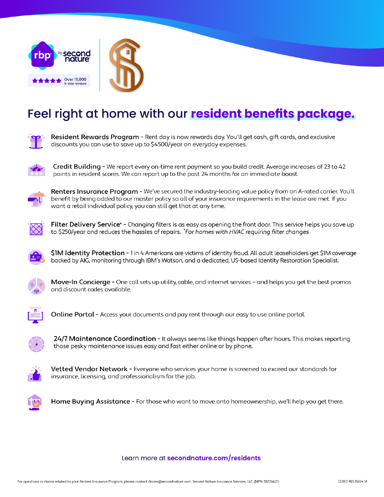 All Sincere Property Management residents are enrolled in the Resident Benefits Package (RBP) for $46.95/month which includes liability insurance, credit building to help boost the resident’s credit score with timely rent payments, up to $1M Identity Theft Protection, HVAC air filter delivery (for applicable properties), move-in concierge service making utility connection and home service setup a breeze during your move-in, our best-in-class resident rewards program, and much more! More details upon application.